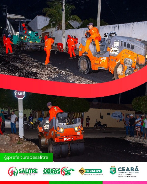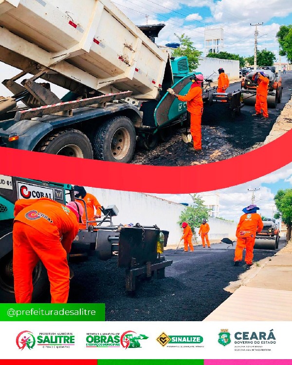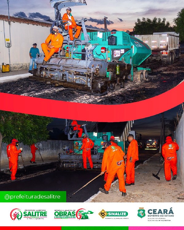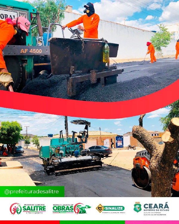 A administração Salitre "O Povo é Quem Faz", deu início nesta segunda dia 09, os serviços de pavimentação asfáltica do Programa "Sinalize", uma valiosa parceria entre o Governo do Estado do Ceará e a Prefeitura de Salitre. O município foi contemplado com 10.000 metros quadrados de asfalto, um investimento que transformará positivamente a mobilidade e a qualidade de vida da população salitrenses.